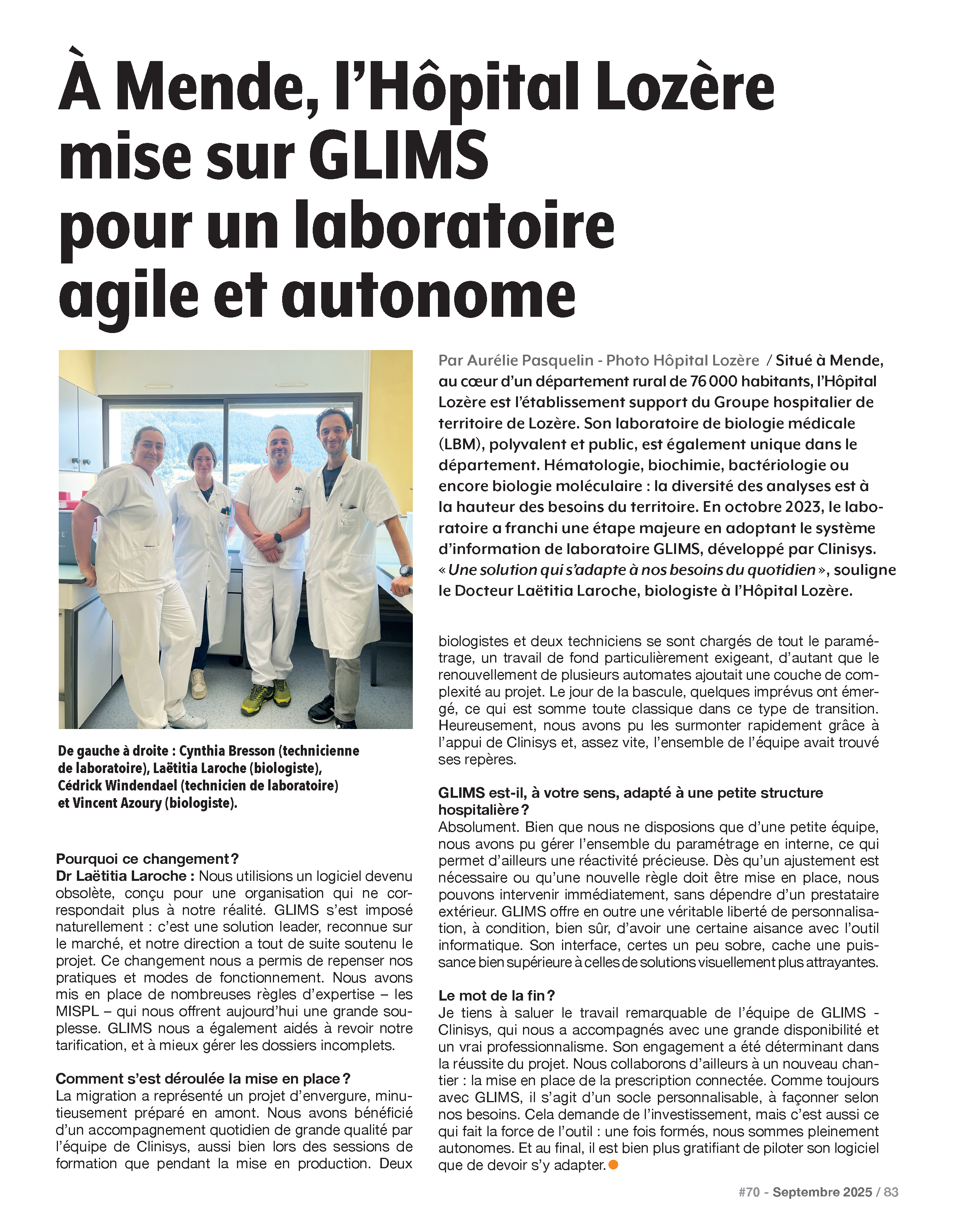 L’Hôpital Lozère, unique laboratoire public du département, a récemment adopté le système d’information de laboratoire (SIL) Clinisys GLIMS. Un changement qui a permis à l’équipe de repenser ses pratiques et de gagner en réactivité grâce à une solution logicielle adaptable à leurs besoins. La migration vers GLIMS, bien préparée, a été soutenue par un accompagnement de qualité et l’implication de toute l’équipe Clinisys. Ce changement de SIL offre désormais au laboratoire une gestion optimisée des analyses et une plus grande autonomie dans l’évolution de leurs processus.