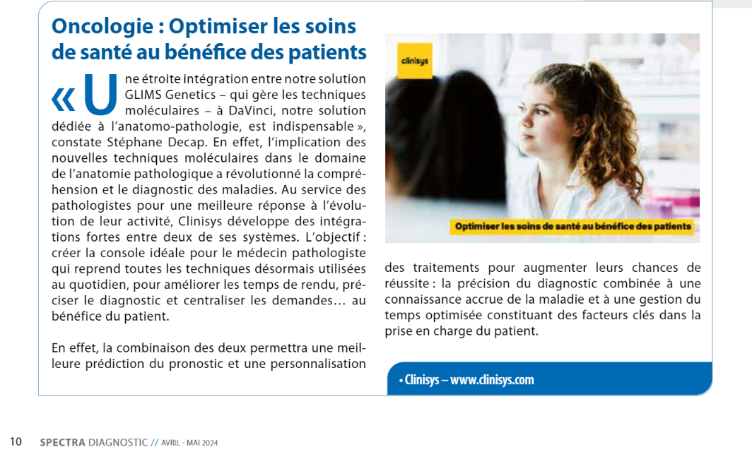 Proposer des solutions particulièrement communicantes et intégrées, au bénéfice des utilisateurs de nos logiciels (ici Glims Genetics, logiciel dédié à la génétique et DaVinci, dédié à l’anatomo-pathologie) afin qu’ils puissent mieux traiter les cas qu’ils reçoivent, c’est l’un de nos objectifs. Une meilleure prise en charge des patients passe par des outils informatiques interconnectés au carrefour des disciplines de diagnostic, comme la biologie moléculaire.