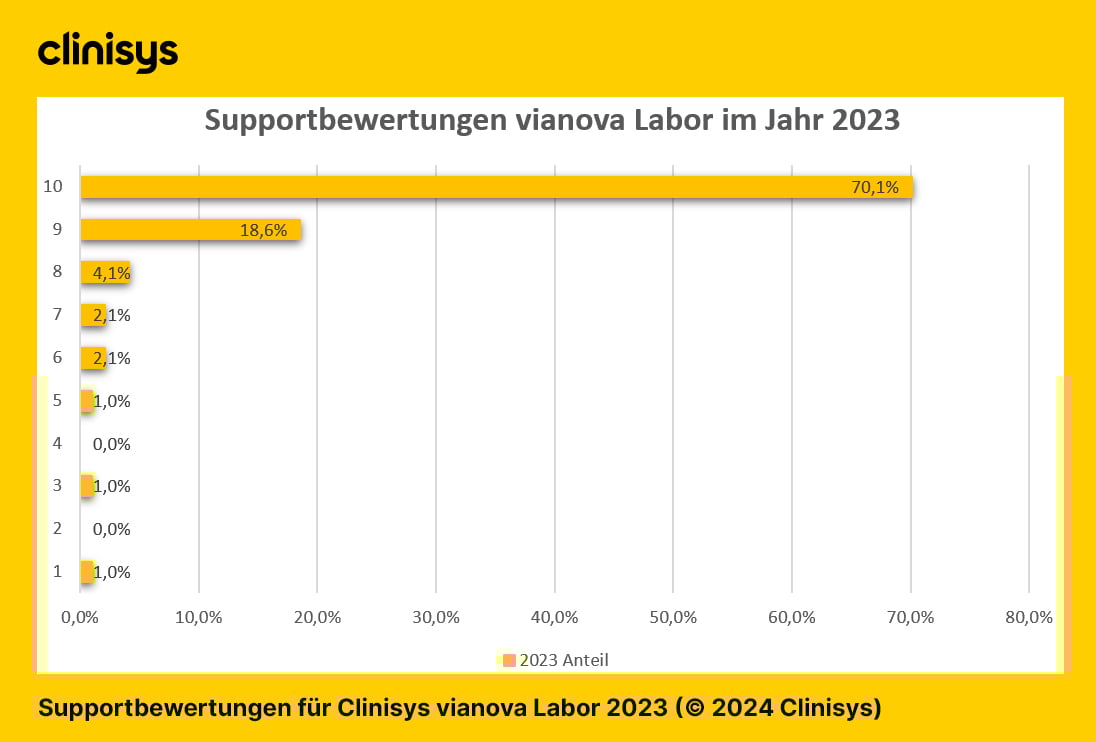 Für das in Deutschland und der Schweiz vertriebene LIS Clinisys vianova Labor, zum Beispiel, bewerten 70,1% der Kunden die Supportleistung mit 10/10 und 18,6% mit 9/10 – ein Ergebnis, das sich sehen lassen kann. Hierfür wertet Clinisys die Ticket-Bewertungen der Kunden aus, die auf dem Support-Portal ihre Zufriedenheit mit der Problemlösung zwischen 1 (schlecht) und 10 (sehr gut) angeben können.