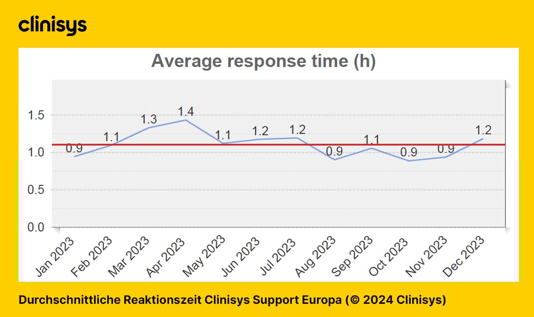 Die jüngsten Umfragen zur Kundenzufriedenheit bestätigen den positiven Trend aus 2022 und sind für Clinisys weiterhin Ansporn, ausgezeichnete Produkte sowie Support- und Serviceleistungen bereitzustellen. Auch die internen Erfolgsmessungen, wie z.B. Reaktionszeiten für Supportanfragen, sind sehr zufriedenstellend. So überstieg in allen EU-Ländern die durchschnittliche Reaktionszeit im Jahr 2023 nie den Höchstwert von 1,4 Stunden, die schnellste Reaktionszeit betrug sogar nur 0,9 Stunden.