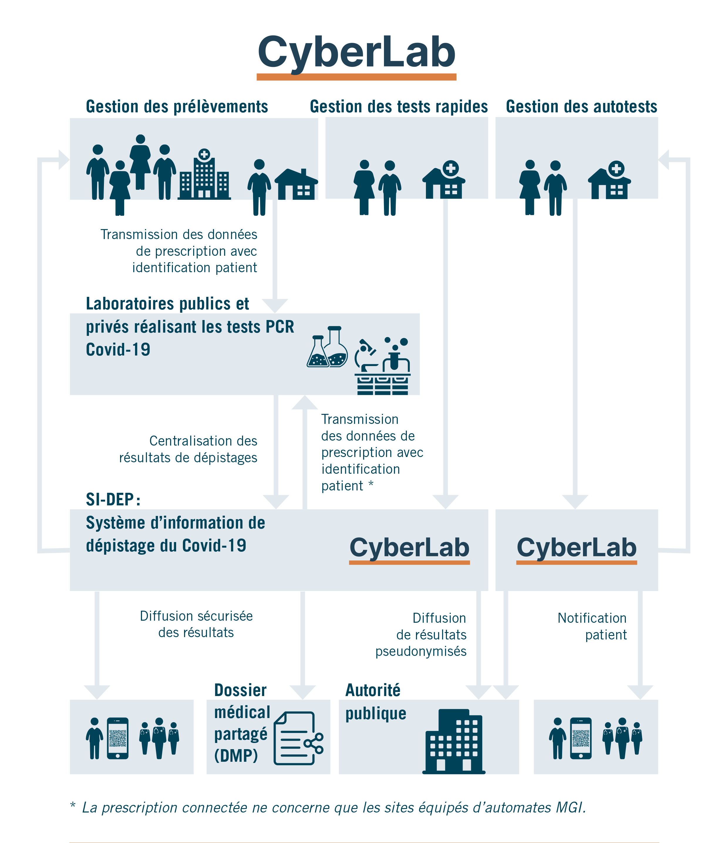 Après une première phase où seul le dépistage PCR était remonté dans SI-DEP, ont été ensuite intégrés les tests sérologiques, puis les tests antigéniques. Depuis mi-novembre 2020, les pharmaciens, les infirmières et les médecins libéraux alimentent également la plateforme avec la possibilité de saisir directement les résultats des tests antigéniques de leurs patients via l’interface utilisateur de CyberLab. À partir de 2022, CyberLab SI-DEP peut traiter un volume de 4 400 000 tests par jour (sans inclure les autotests). Les résultats des tests sont transmises aux patients et leurs prescripteurs, ainsi qu’au dossier médical partagé (DMP) central.
