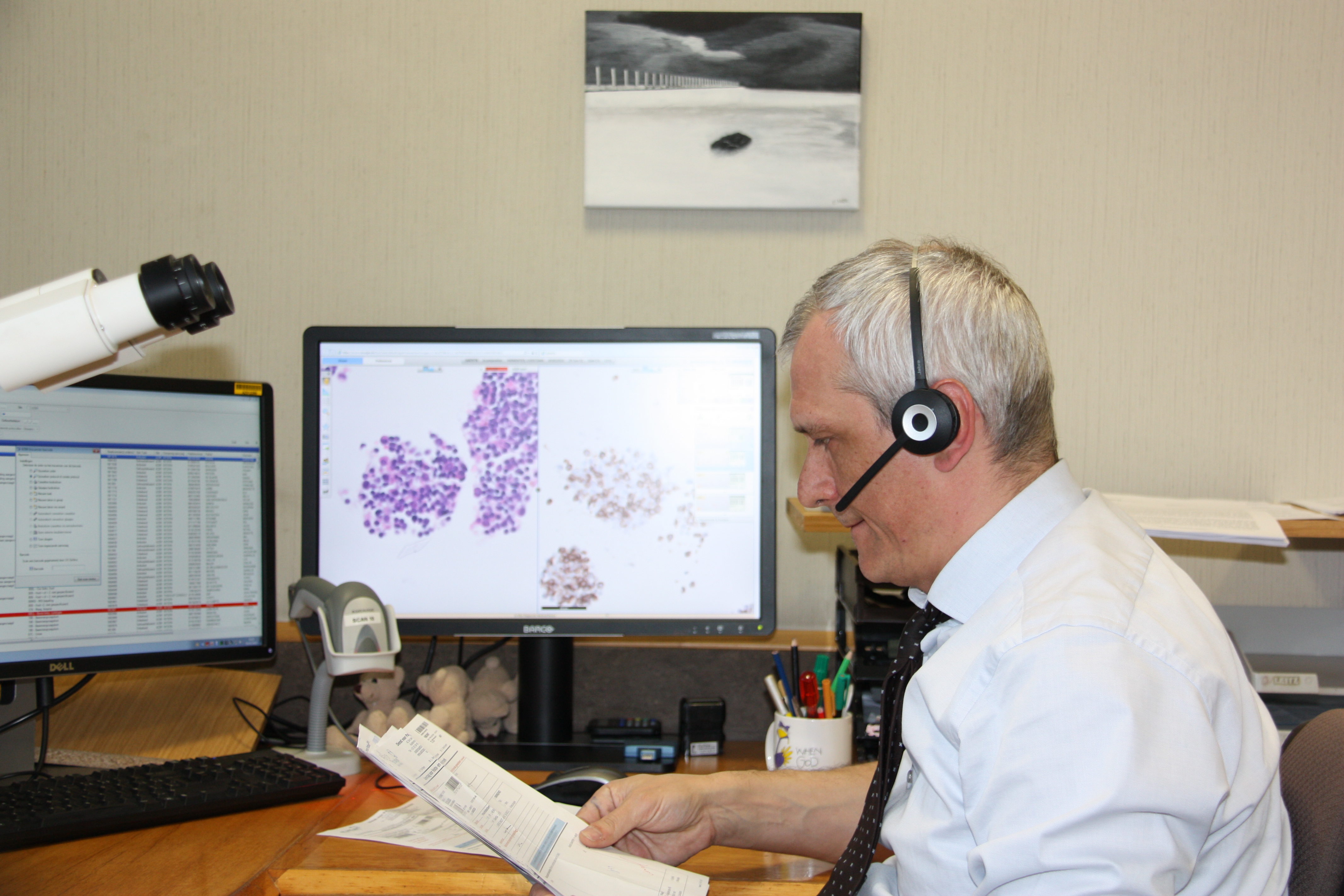 Het laboratorium, met vier pathologen die jaarlijks ongeveer 17,000 biopsies verwerken, heeft recent ook geïnvesteerd in digitale pathologie. “In de klassieke pathologie, bekijkt de patholoog de coupes onder een microscoop. Maar met digitale pathologie worden de coupes gescand met een hoge-resolutiescanner, zodat de patholoog de beelden kan bekijken op een computerscherm. En dat is niet alles: met één enkele muisklik kunnen die beelden ook gedeeld worden met collega’s overal ter wereld. Zo kunnen pathologen beelden bekijken en een verslag dicteren vanop om het even welke locatie; ze kunnen bv. internationale overlegplatformen creëren en netwerken vormen voor de diagnose van zeldzame tumoren.”