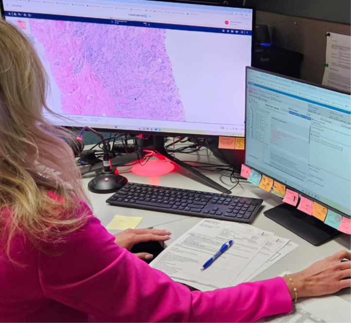 Nicole Durie, MD, digitally reviews slides at P&C Labs.
