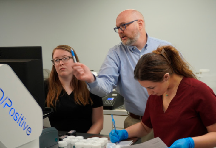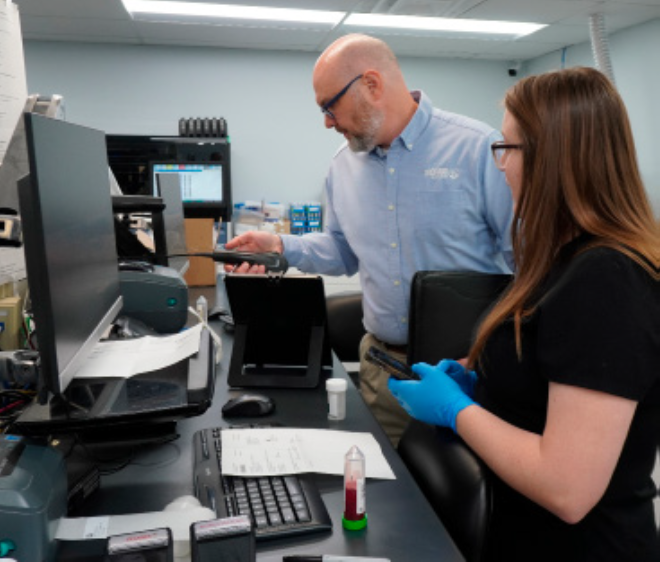 Jeff Johnston, Clinisys™ Orchard® Field Implementation Analyst, instructs Rachel Kirk and Emily Miller at P&C Labs during system go-live.
