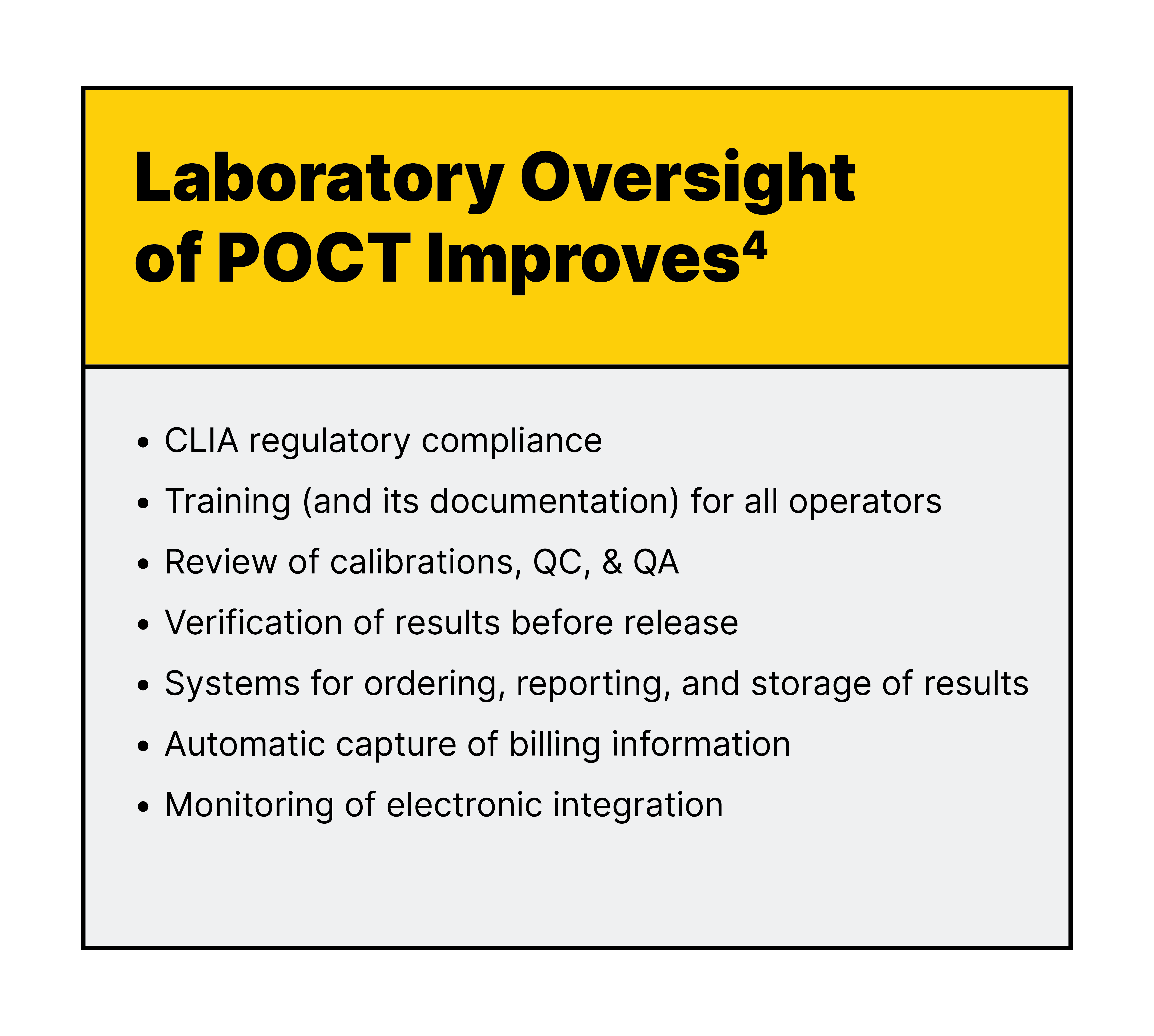 In order to achieve the real-time benefits associated with POCT, not only does the test have to be performed at the point of care, but the results have to be electronically integrated into the patients’ charts and immediately available to the care team. When this is the case, POCT can improve the efficiency of providers and potentially improve patient outcomes.1 However, management of POCT dispersed throughout a healthcare organization presents many challenges. For example, POCT often takes place in silos within a larger healthcare delivery network and may not be under the  laboratory’s management.