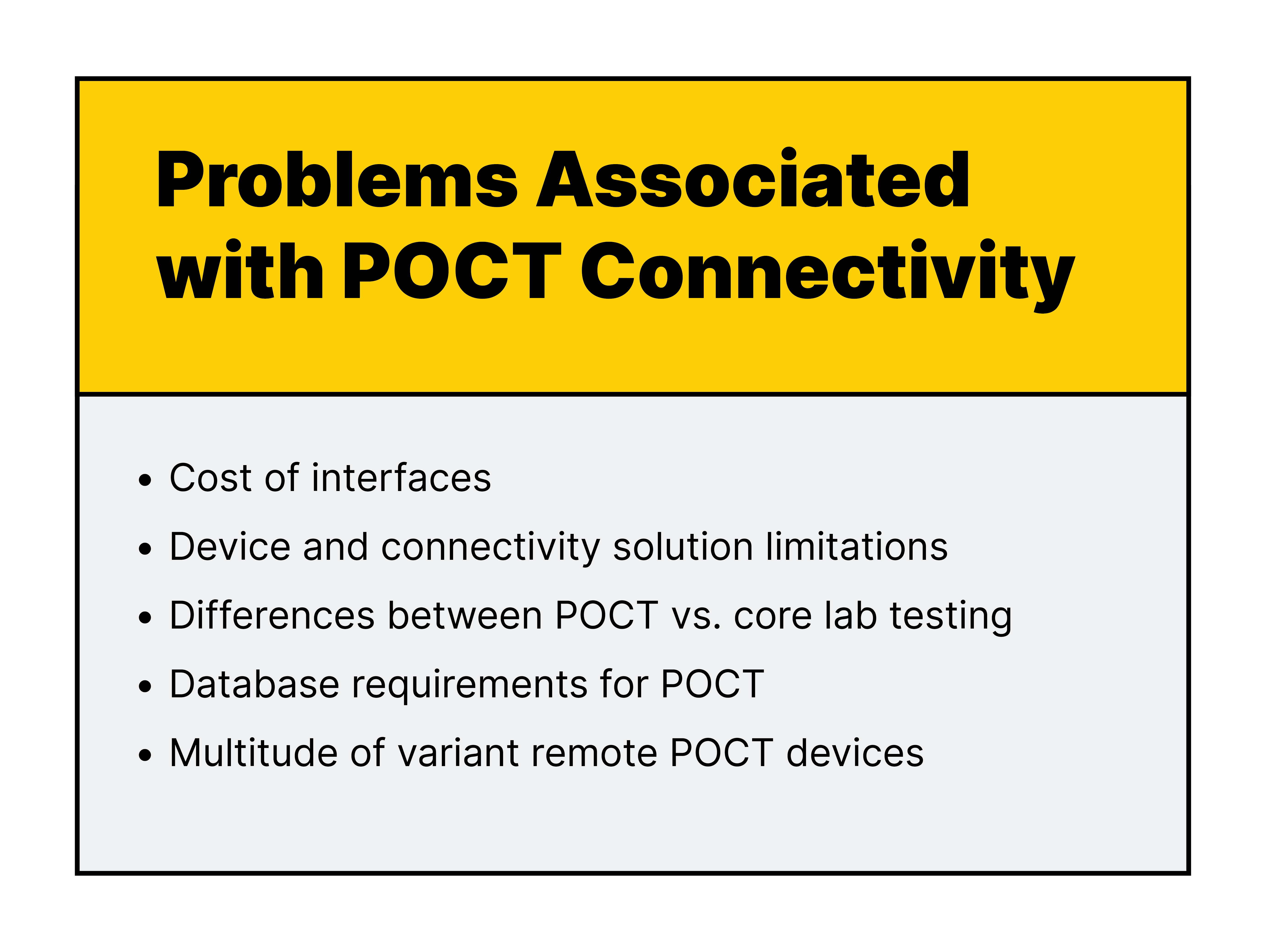 In years past, manufacturers of POCT devices focused on improving analytical performance. Laboratories would integrate POCT solutions without concern over how the results would be integrated. Now, these manufacturers must also provide up-to-date connectivity and informatics  solutions inherent to the devices in order for the POCT devices to be relevant. Savvy laboratories are looking for POCT solutions capable of data integration and IT solutions that encompass all aspects of laboratory information management.4